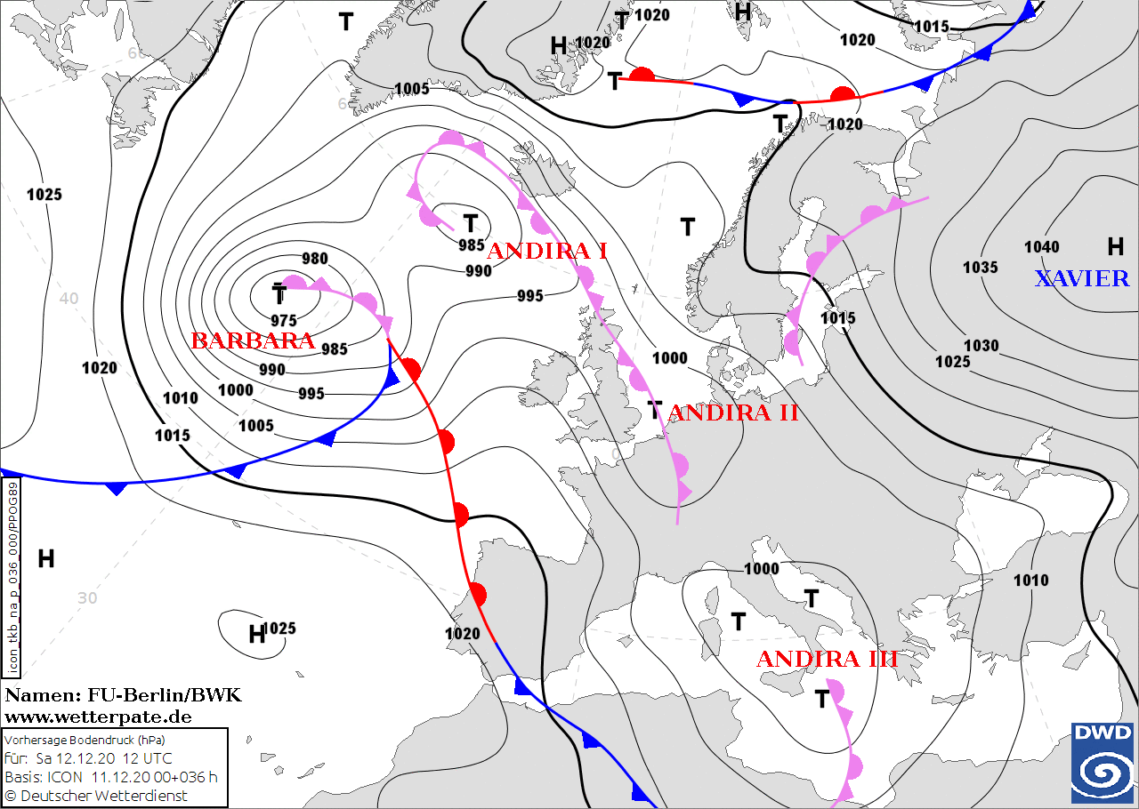 Noms des dépressions et anticyclones prévus pour samedi 12 décembre 2020 à midi (Berlin)